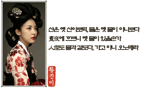 ‘산은 옛산이로되 물은 옛물이 아니로다./주야(晝夜)에 흐르니 옛물이 있을소냐./인걸(人傑)도 물과 같도다 가고 아니 오노매라. –황진이