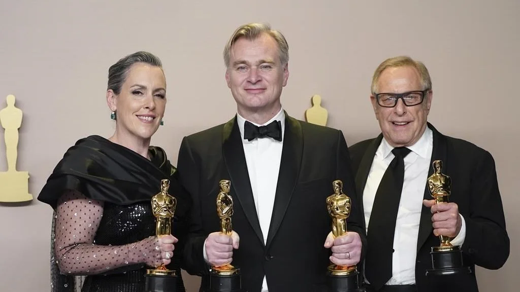 *Emma Thomas, from left, Christopher Nolan, and Charles Roven pose in the press room with the award for best picture for "Oppenheimer" at the Oscars