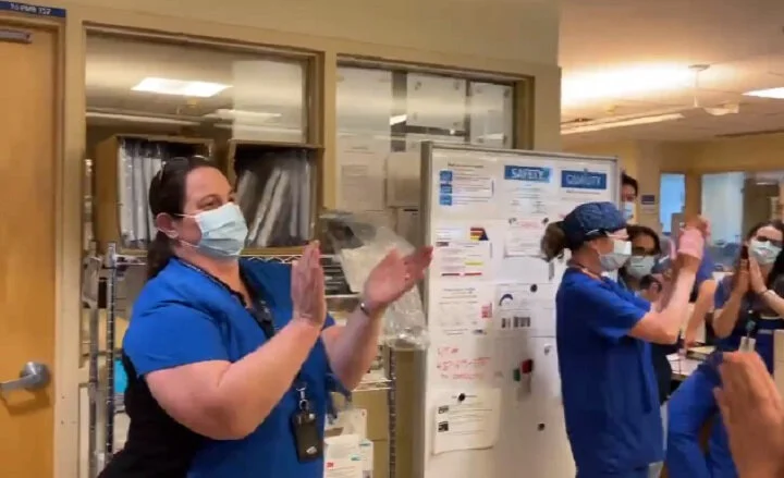 *토론토 제너럴 병원 의료진이 16일 ‘코로나 환자 제로’를 선언한 후 박수를 치고 있다.