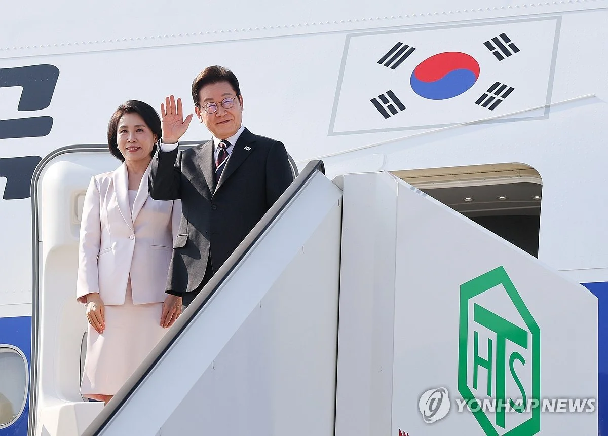 *한일 정상회담을 마친 이재명 대통령과 부인 김혜경 여사가 24일 일본 도쿄 하네다공항에서 도널드 트럼프와 한미 정상회담을 위해 워싱턴DC로 향하며 공군1호기에 올라 인사하고 있다.