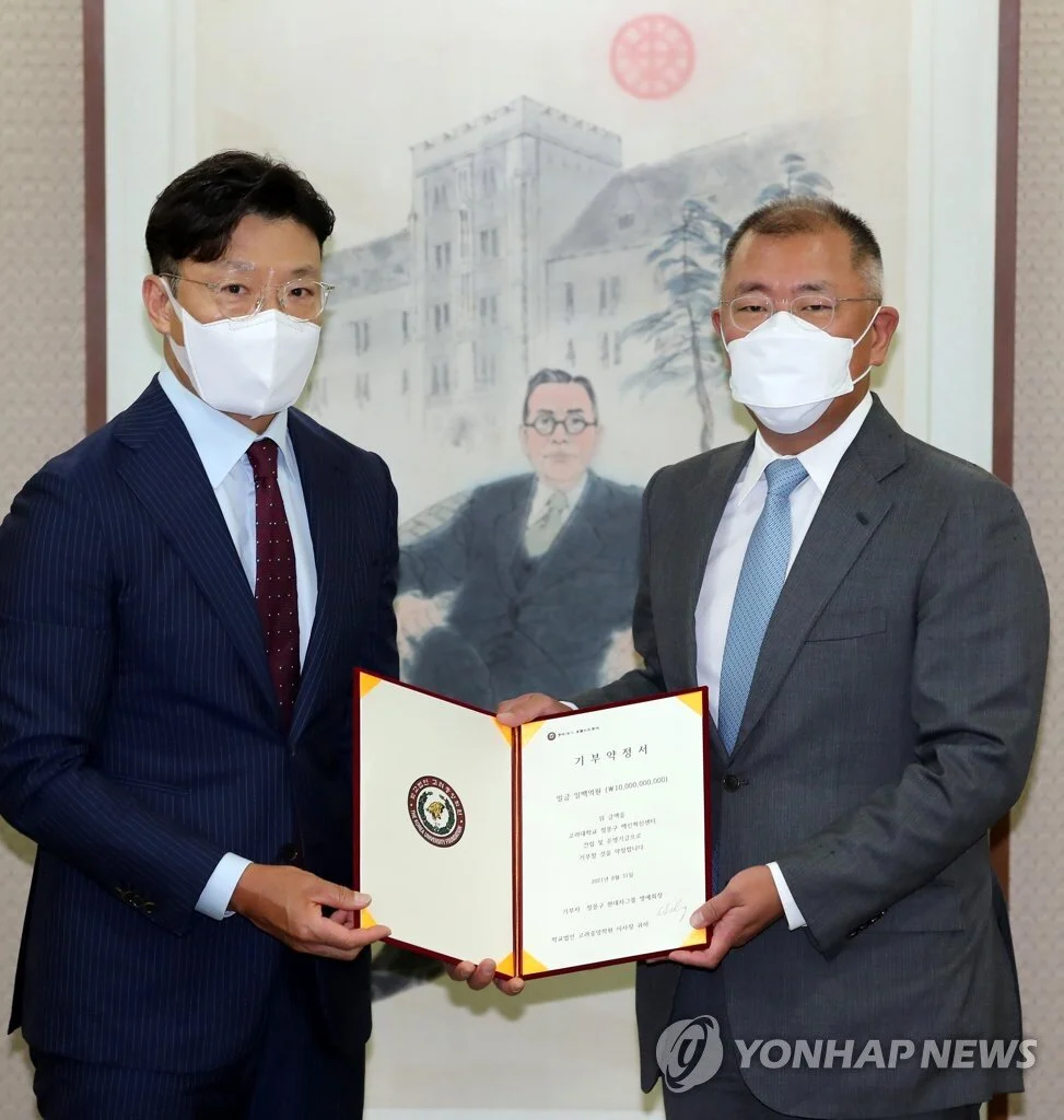 체결식에는 고령인 정 명예회장을 대신해 아들 정의선 회장이 참석했으며, 김재호 고려중앙학원 이사장, 정진택 고려대 총장, 김걸·공영운 현대차그룹 사장도 함께했다.