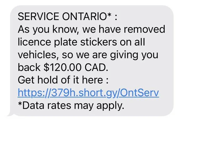 온주정부가 차랑번호판 스티커 폐지하면서 스티커 갱신료(연간 120불)를 반환해줄 예정인 가운데, 정부(Service Ontario)를 사칭한 텍스트 문자 보내 신상정보 요구하는 사기행위 발생…