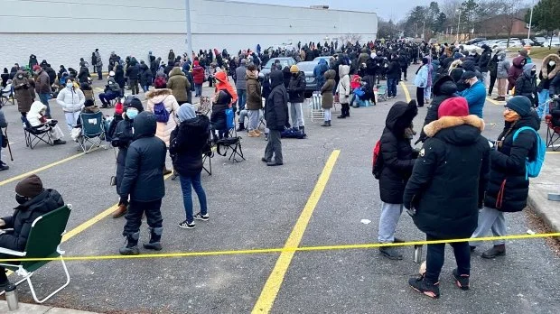 *리치몬드힐 힐크레스트 몰에서 코로나 신속 진단키트를 받기 위해 길게 줄을 선 시민들