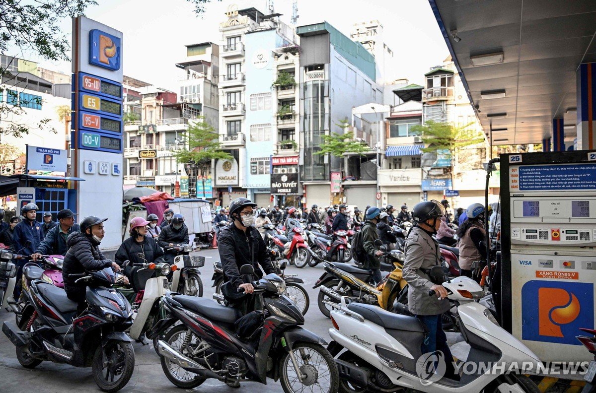 *베트남 하노이의 한 주유소에 휘발유를 넣으려는 오토바이 운전자들이 줄 서 있다.