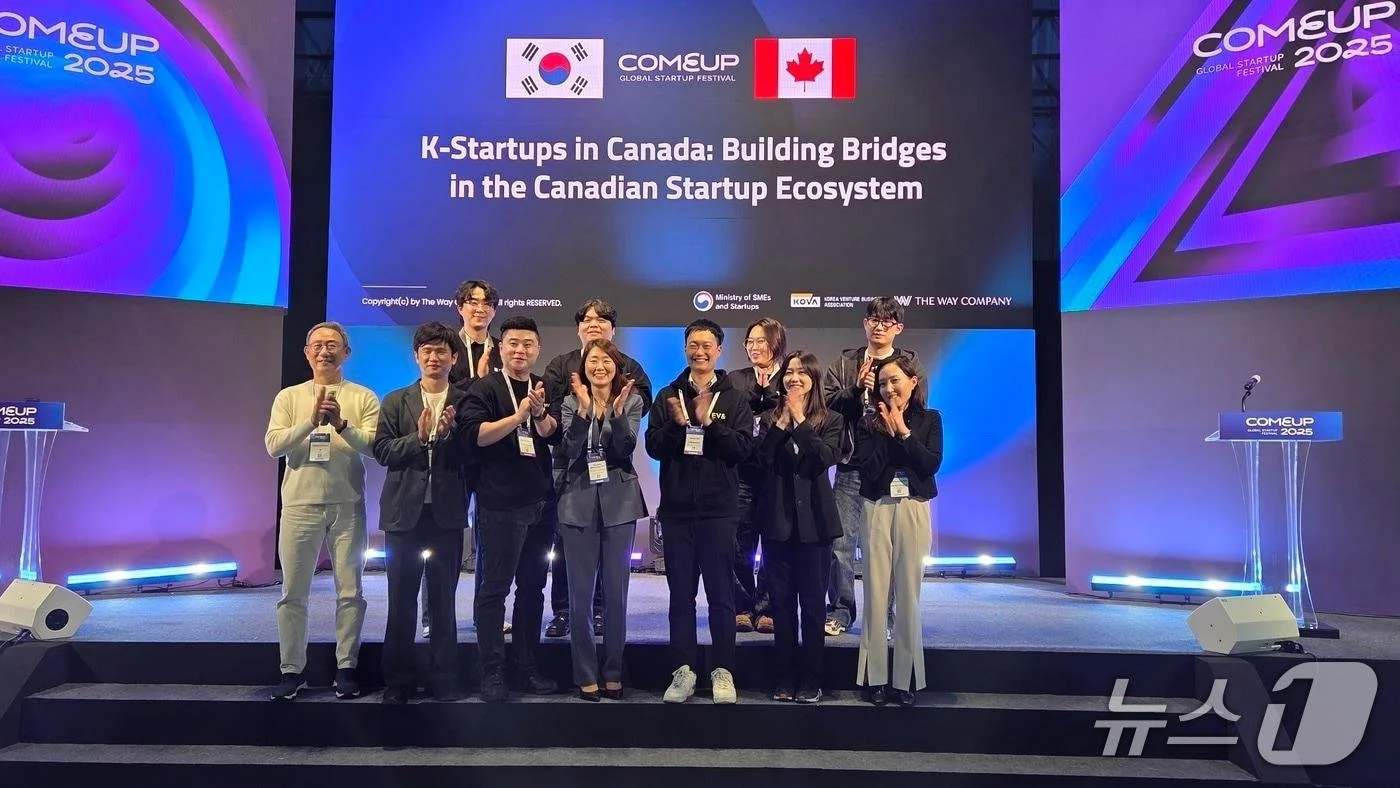 *서울 강남구 코엑스에서 열린 '컴업(Comeup) 2025'에서 '캐나다 창업 생태계 및 시장 진출 사례'에 대한 주제발표를 한 토론토 더웨이컴퍼니의 미셸김(김민경) 대표(앞줄 가운데)와 한인 스타트업 대표들 (아래에 관련 기사).