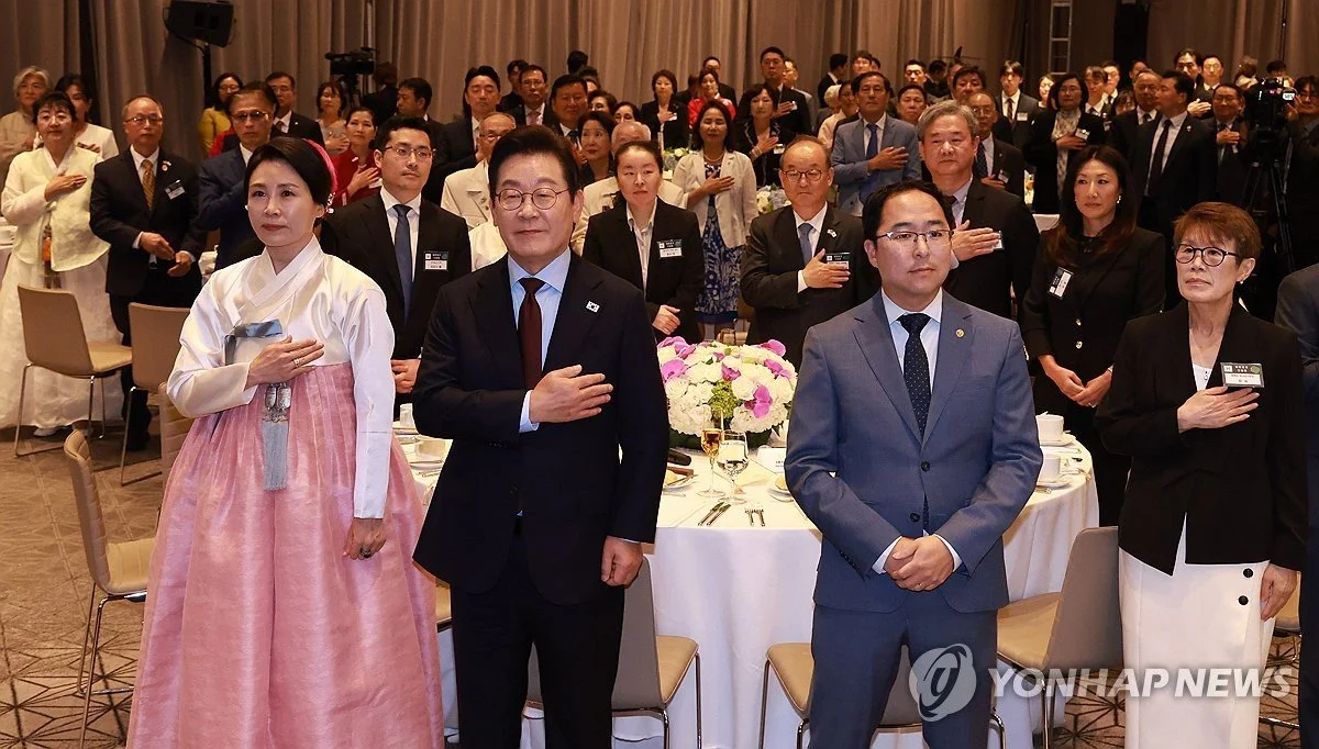 *이재명 대통령과 김혜경 여사가 24일 미국 워싱턴DC의 한 호텔에서 열린 동포 만찬 간담회에서 국기에 경례하고 있다.