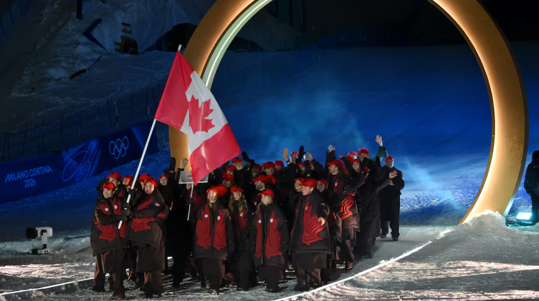 *이탈리아 밀라노의 산시로 올림픽 스타디움에서 열린 개회식에서 캐나다팀이 입장하고 있다.