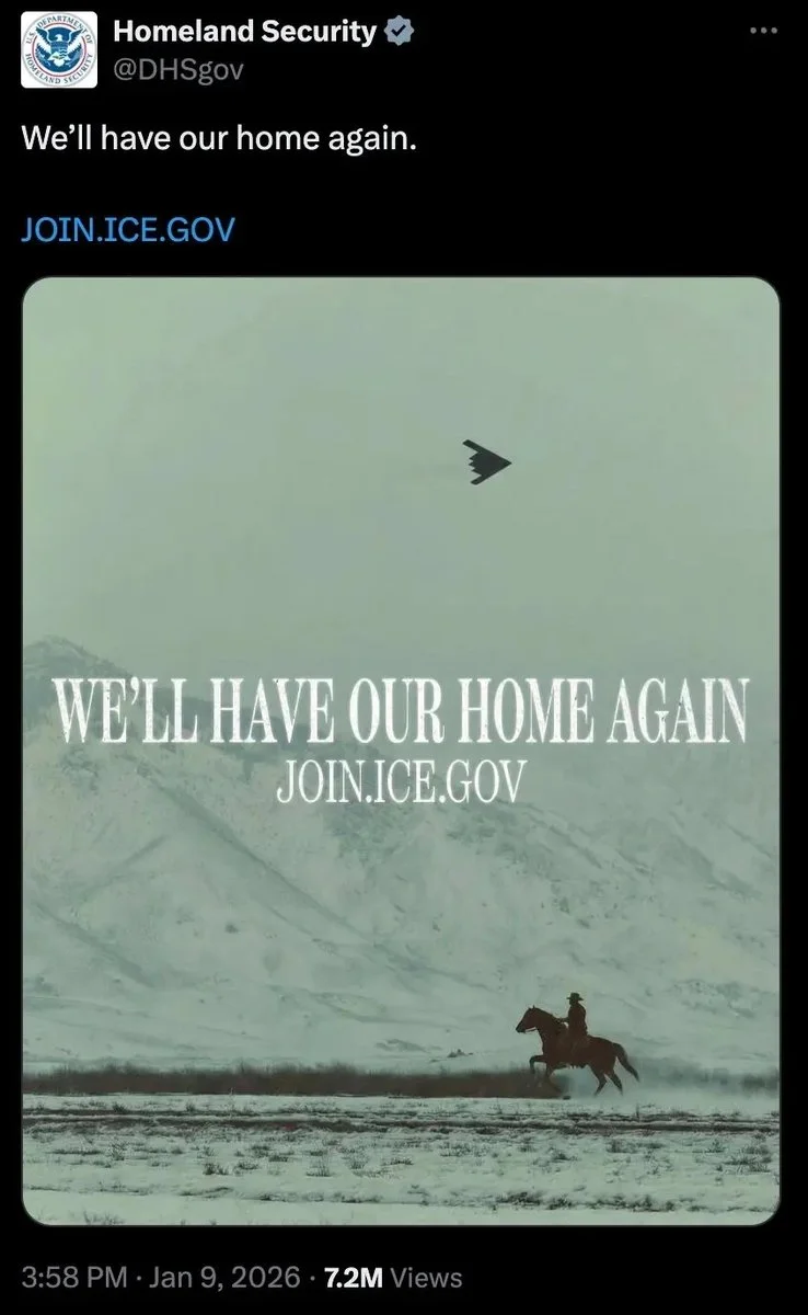 올해 1월 백악관과 국토안보부가 함께 인스타그램, 페이스북, X 등 소셜 미디어에 올린 이민세관단속국(ICE) 인력 채용 게시물에는 "우리는 우리 집을 되찾을 거야"(WE'LL HAVE OUR HOME AGAIN)이라는 문구가 큼지막하게 적혀 있었다.