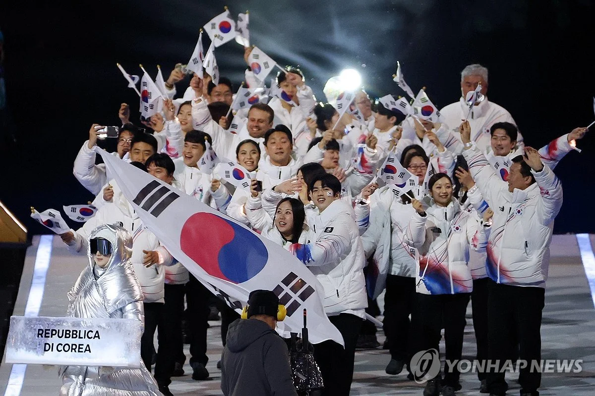 *6일 이탈리아 밀라노 산시로 스타디움에서 열린 2026 밀라노-코르티나담페초 동계올림픽 개회식. 대한민국 선수단이 22번째로 입장하고 있다. (아래 관련기사)