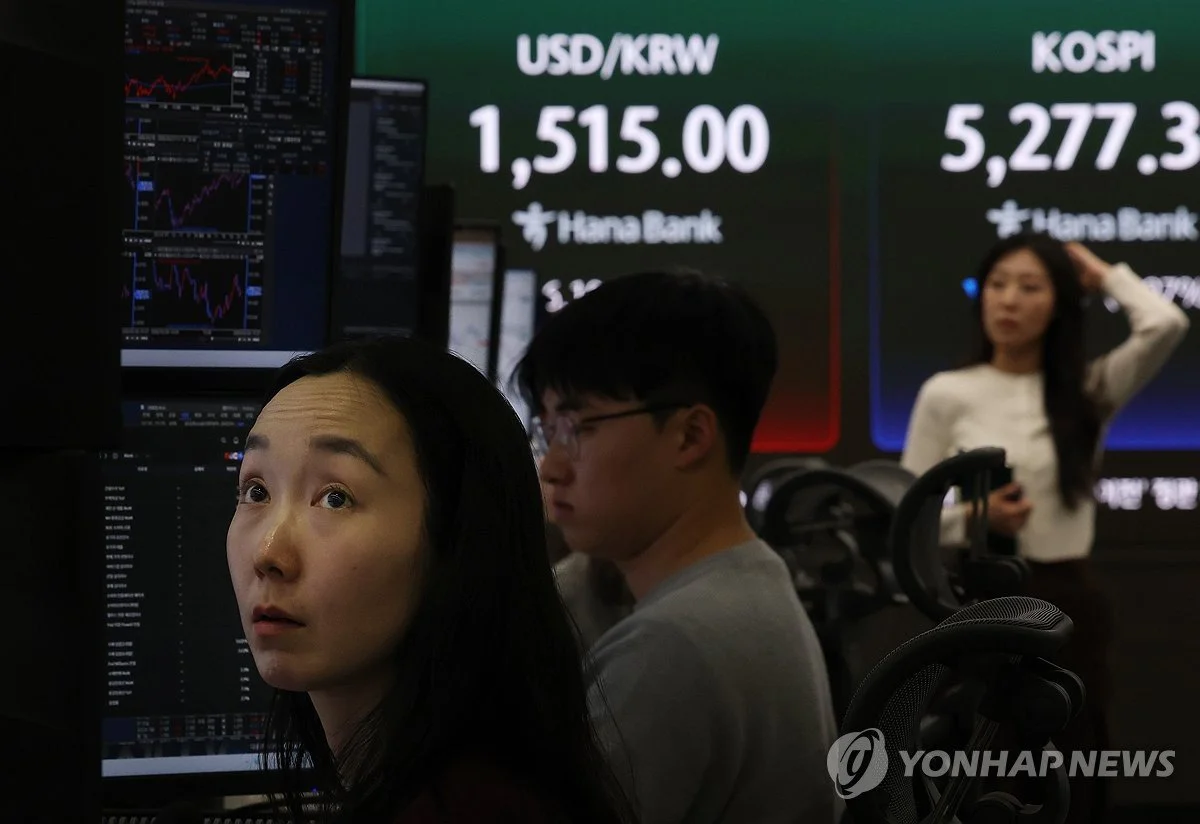*30일 서울 중구 하나은행 본점 딜링룸 전광판에 코스피 종가와 원/달러 환율이 표시돼 있다. 이날 코스피는 전장보다 161.57포인트(2.97%) 내린 5,277.30에 장을 마쳤다. 원/달러 환율은 6.8원 오른 1,515.7원을 기록했다.