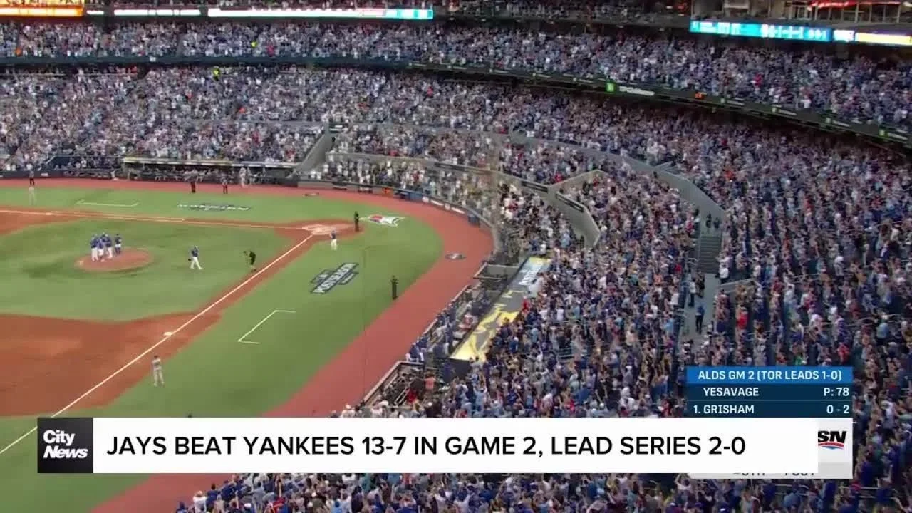 메이저리그(MLB) 토론토 블루제이스가 이틀 연속 뉴욕 양키스 마운드를 무너뜨리며 아메리칸리그 챔피언십시리즈(ALCS) 진출까지 1승만을 남겨뒀다.