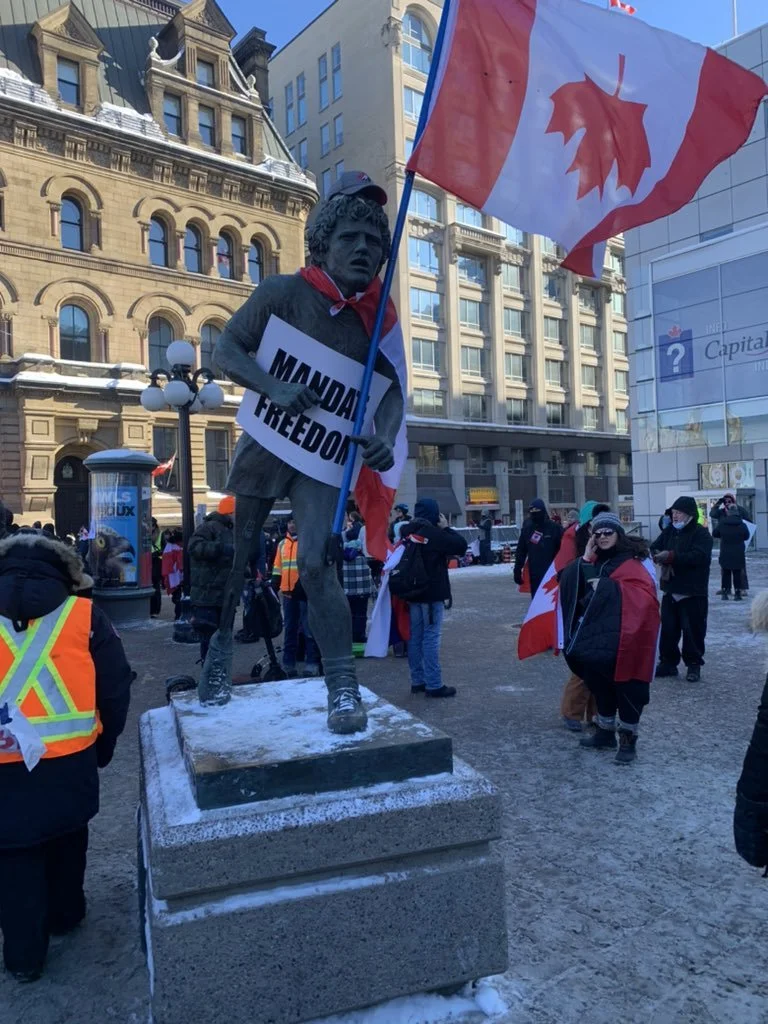 과격 시위대들, 캐나다의 아이콘인 테리 팍스 동상에 캐나다 국기를 거꾸로 들게 하고 목에도 국기를 두르는가 하면 시위구호 팻말을 들고 있게 하는 등 비상식적인 행동으로 비난 빗발…