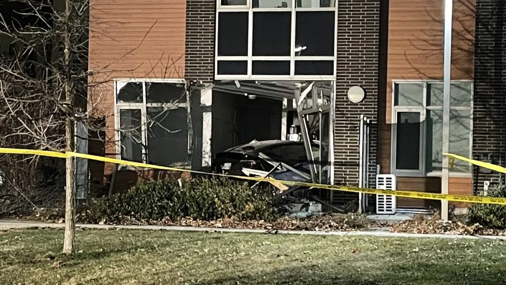 어제(목)밤 자정 무렵 노스욕 타운하우스단지(Parkway Forest Drive: Don Mills & Sheppard)에 테슬라 차량이 도로를 벗어나 돌진…