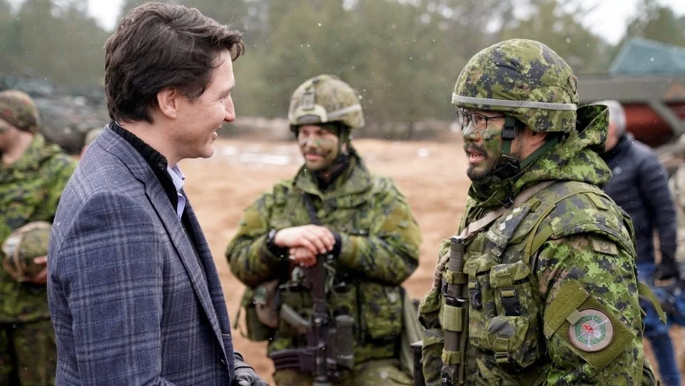 *저스틴 트뤼도 캐나다 총리가 라트비아 군기지를 방문해 현지 주둔중인 캐나다 장병들을 격려하고 있다.