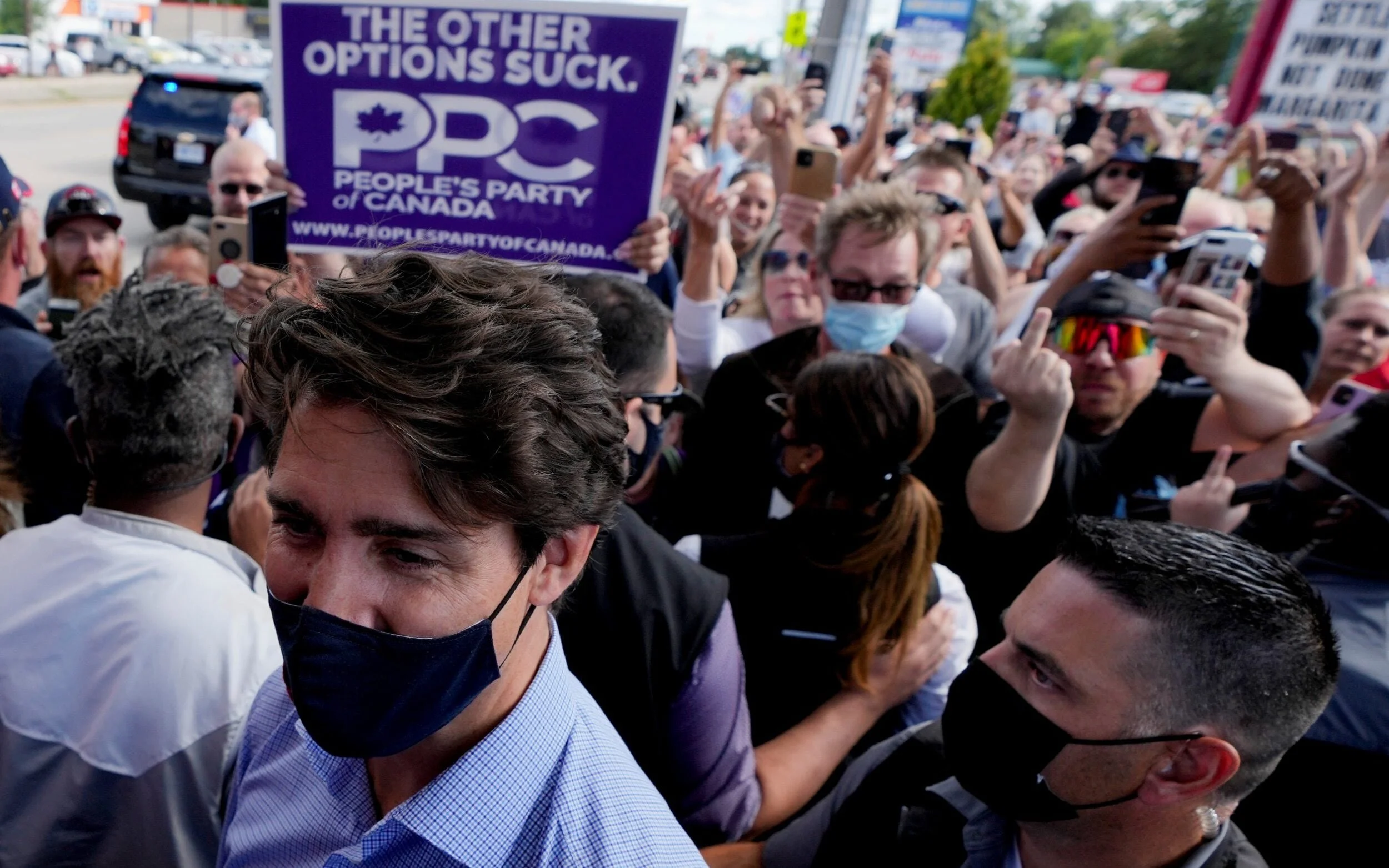 저스틴 트뤼도 자유당 대표(현 총리), 6일 온타리오 런던서 유세 도중 백신반대 시위대에 돌조각 세례 봉변…