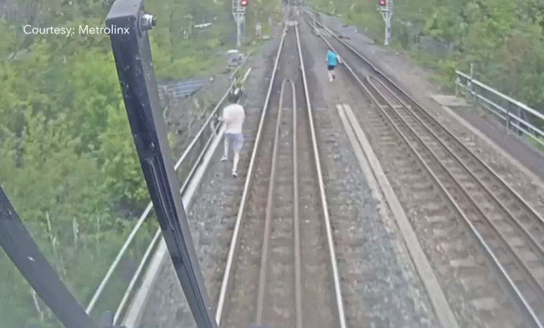 달려오는 GO 트레인 앞에서 철로를 뛰어가는 3명의 젊은이들…