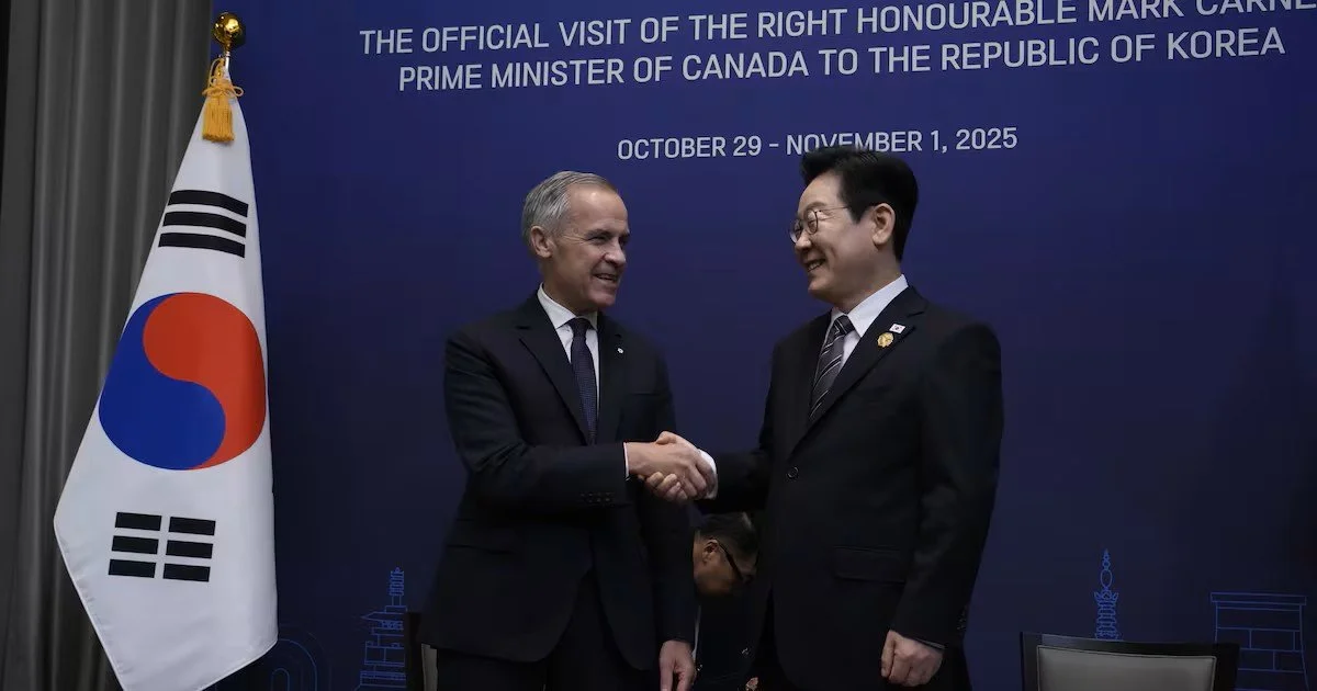*이재명 대통령과 마크 카니 캐나다 총리가 지난해 10월 30일 경북 경주의 한 호텔에서 정상회담에 앞서 악수하는 모습
